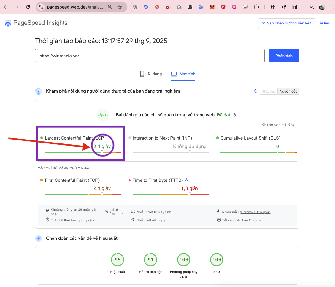 Bên em có thể giúp tối ưu để đưa LCP về dưới 2,5 giây và cải thiện điểm số lên trên 90, giúp website tải nhanh hơn, thân thiện hơn với Google.”